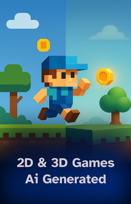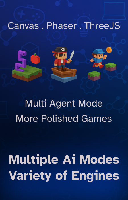 From 2D arcade to 3D space shooters, platformers, puzzles, and more. You can choose your game engine (Canvas, Phaser, Three.js) and even ask for specific game styles or mechanics.